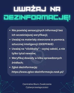 Jeśli zauważysz treści, które mogą być dezinformacją, zgłoś je do NASK. Formularz zgłoszeniowy dostępny jest na stronie kampanii: www.nask.pl/dezinfo.