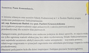 Na ręce Pana Komendanta Powiatowego Policji w Środzie Śląskiej, mł. insp. Artura Dobrowolskiego, wpłynęły serdeczne podziękowania od uczniów oraz nauczycieli Szkoły Podstawowej nr 1 na Winnej Górze.