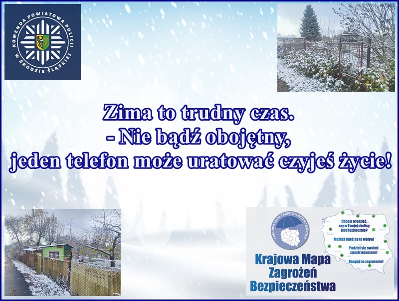 Średzcy policjanci zwracają się z prośbą do wszystkich mieszkańców naszego powiatu, aby w przypadku napotkania w okresie zimy osób potrzebujących pomocy, samotnych, niepełnosprawnych lub nietrzeźwych, których pozostawienie na mrozie może skończyć się tragicznie, nie zwlekali REAGOWALI i DZWONILI pod numer alarmowy 112. Policjanci niezwłocznie podejmą stosowne czynności.