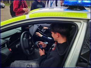 Atrakcje czekały także na zewnątrz obiektu, gdzie zaprezentowano jeden z najnowszych radiowozów policyjnych. Uczestnicy mogli wsiąść do pojazdu, obejrzeć jego wnętrze oraz porozmawiać z funkcjonariuszem Wydziału Ruchu Drogowego Komendy Powiatowej Policji w Środzie Śląskiej. Policjant przybliżał specyfikę swojej pracy, a także udzielał informacji na temat obowiązujących i nowych przepisów ruchu drogowego.
